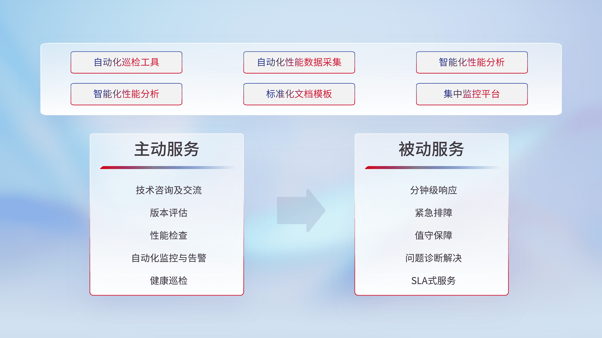 智能化工具和标准化文档,,保障服务质量,,,,提供主动服务(包含技术咨询、、、、版本评估、、、性能检查、、、、自动化监控与告警、、健康巡检)和被动服务包含(分钟级响应、、紧急排障、、值守保障、、、、问题诊断解决、、SLA服务)。。。
